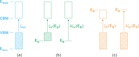 Fig. 1. Concepts of the PRFs for SHG responses: (a) The total response \(\mathbf{\zeta}_{\mathbf{\text{tot}}}\). (b) The partial responses associated with the VBs. \(\mathbf{\zeta}_{\mathbf{V}}\mathbf{(E}_{\mathbf{B}}\mathbf{)}\) refers to the contribution from all states of the VBs lying above EB to all CBs, and \(\mathbf{\delta}\mathbf{\zeta}_{\mathbf{V}}\mathbf{(E}_{\mathbf{B}}\mathbf{)}\) to that only from the EB level to all CBs. (c) The partial responses associated with the CBs. \(\mathbf{\zeta}_{\mathbf{C}}\mathbf{(E}_{\mathbf{B}}\mathbf{)}\) refers to the contribution from all states of the VBs to all states of the CBs up to EB, and \(\mathbf{\delta}\mathbf{\zeta}_{\mathbf{C}}\mathbf{(E}_{\mathbf{B}}\mathbf{)}\) to that from all VBs only to the EB of the CBs